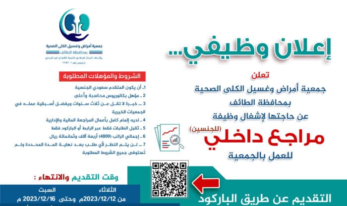 إعلان وظيفي لوظيفة (مراجع داخلي) لكلى الجنسين من حملة مؤهل بكالوريوس محاسبة وأعلى