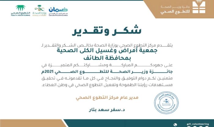 بحمد الله تعالى تم تكريم الجمعية بشهادة شكر وتقدير على مشاركتها في جائزة وزير الصحة للتطوع الصحي للعام الحالي 2021 م